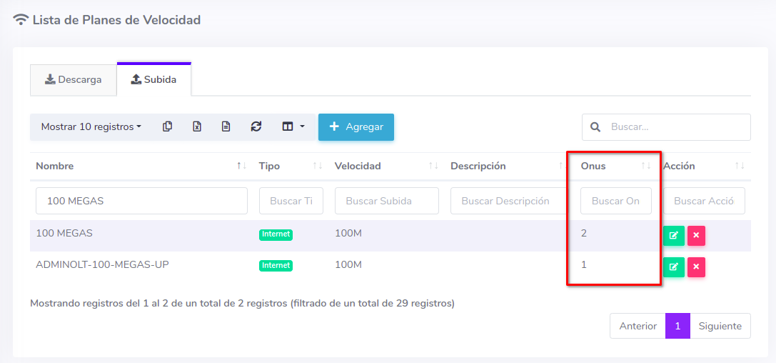 Columna de ONUs en Lista de Planes de Velocidad Descarga/Subida