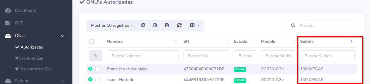 Si verificamos en la Lista de Onus no Autorizadas podemos confirmar que hay 2 registros con el plan de velocidad de bajada; 100 MEGAS