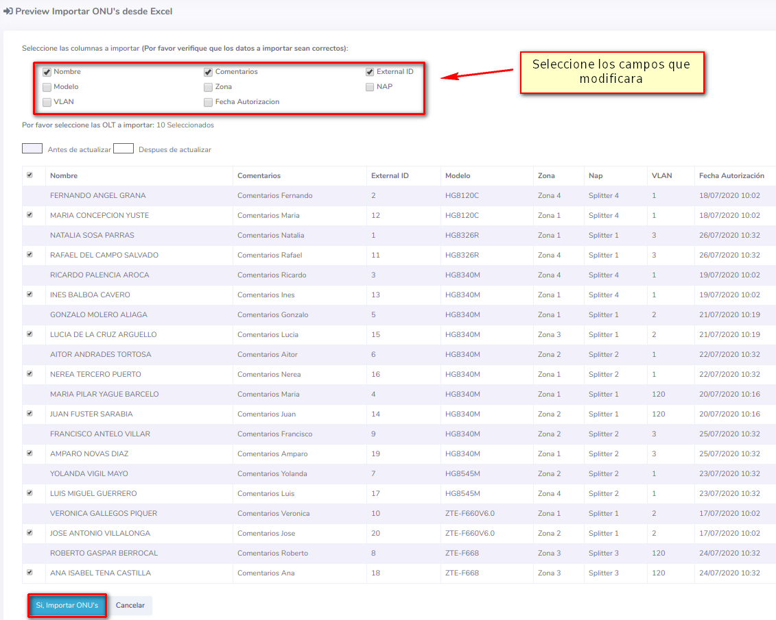 - Modelo: Modelo de la ONU. (Para cambiar este campo debe seleccionar modelos existentes en AdminOLT y escribirlos igual a como estan en el sistema)