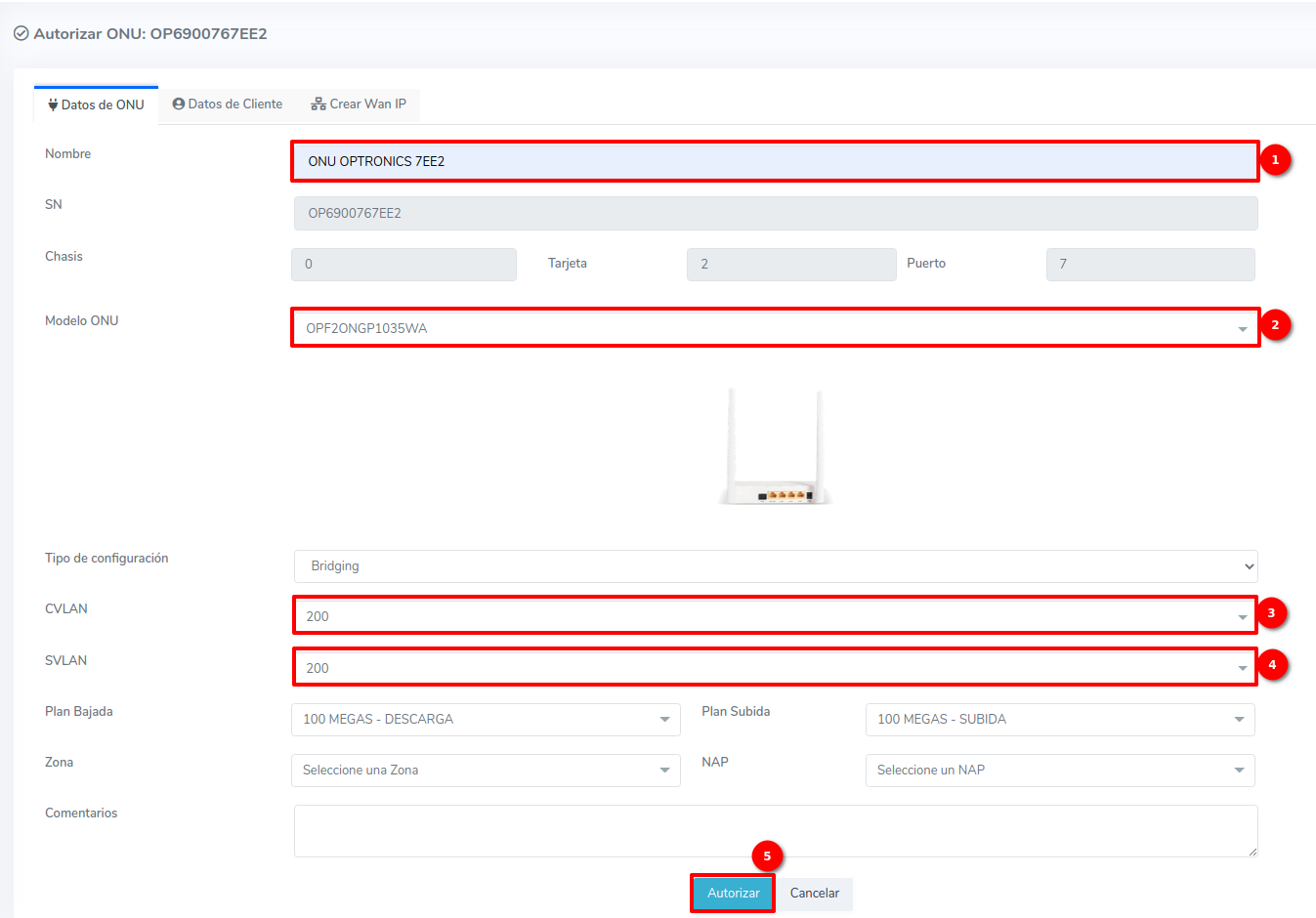 1Para ver los dispositivos que aún no han sido autorizados, debemos dirigirnos a la sección ONU > Sin Autorizar y seleccionar alguna ONU disponible.