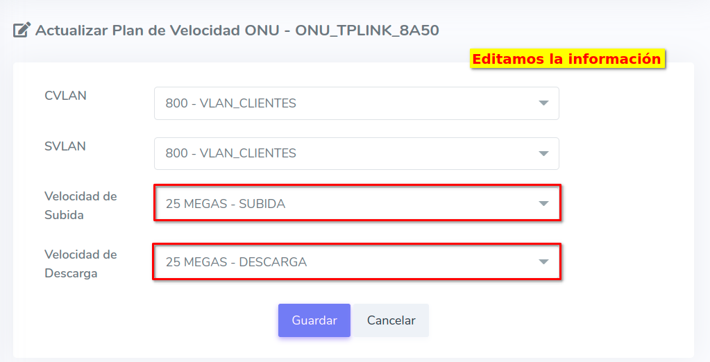 Para este ejemplo usaremos una ONU Autorizada que inicialmente tiene un Plan de 100 Megas, en este caso nosotros lo cambiaremos a un Plan de 25 Megas.