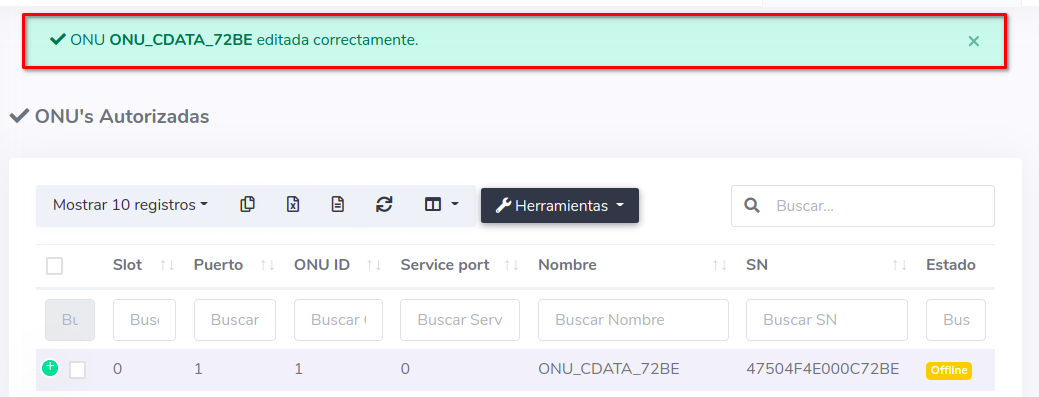 En este momento si vemos el estado de la ONU, este se encuentra en Offline debido a que físicamente no sé ha cambiado la ONU de Puerto, pero en AdminOLT si se ha actualizado la información.