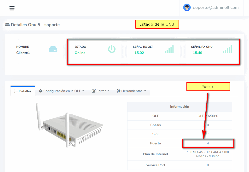 En este paso es importante que coloque la ONU en Puerto correcto ya que si no se hace la ONU seguira saliendo como Offline