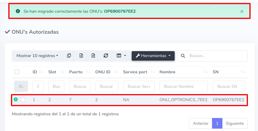 1 En ONU's > Lista de Onu's Autorizadas debemos escoger el equipo con el que se trabajará y seleccionar Migrar ONU a otra OLT que se encuentra en el botón con la leyenda Herramientas.