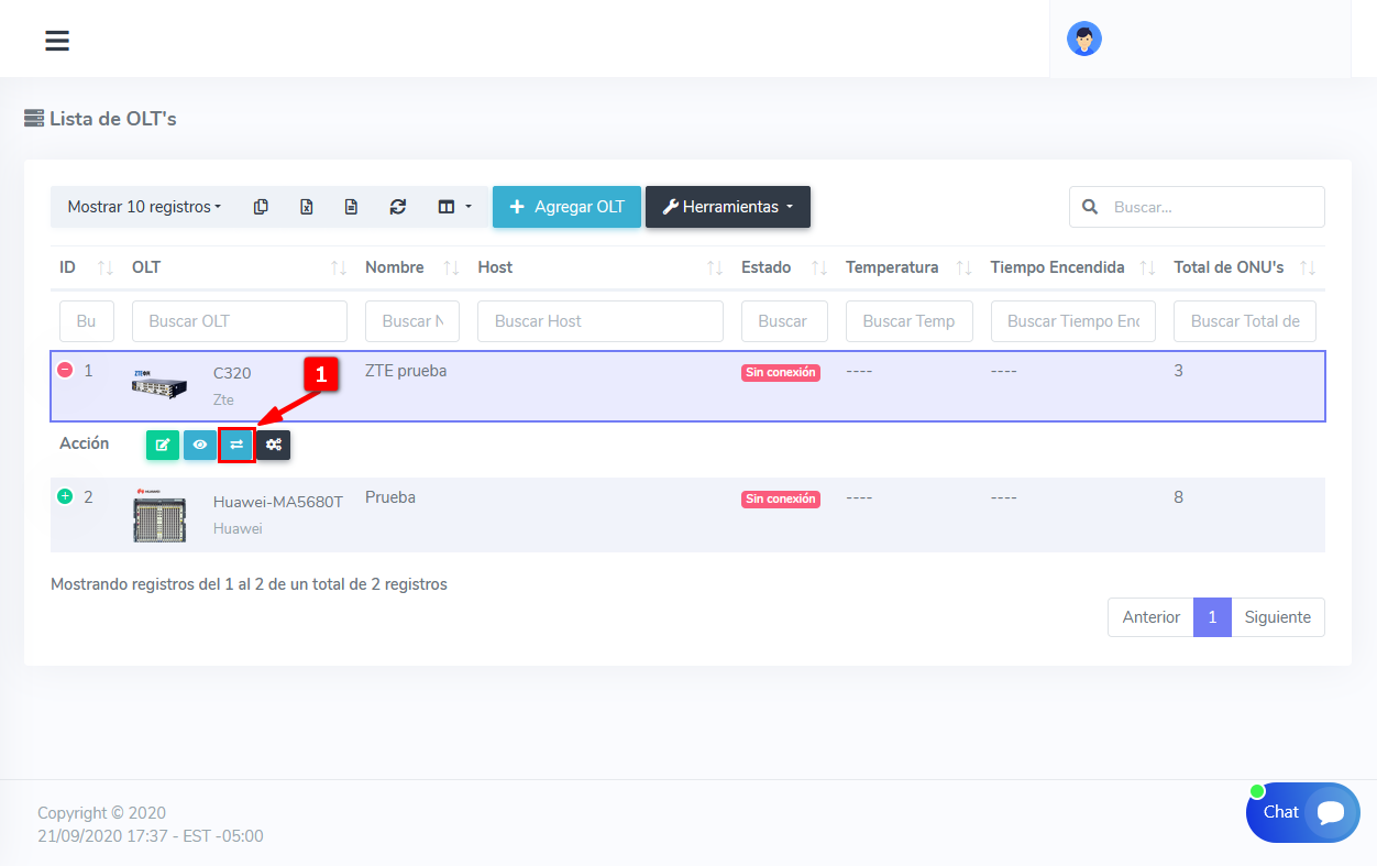 1En lista de OLT seleccionamos el equipo que vamos a conectar y le damos en editar.
