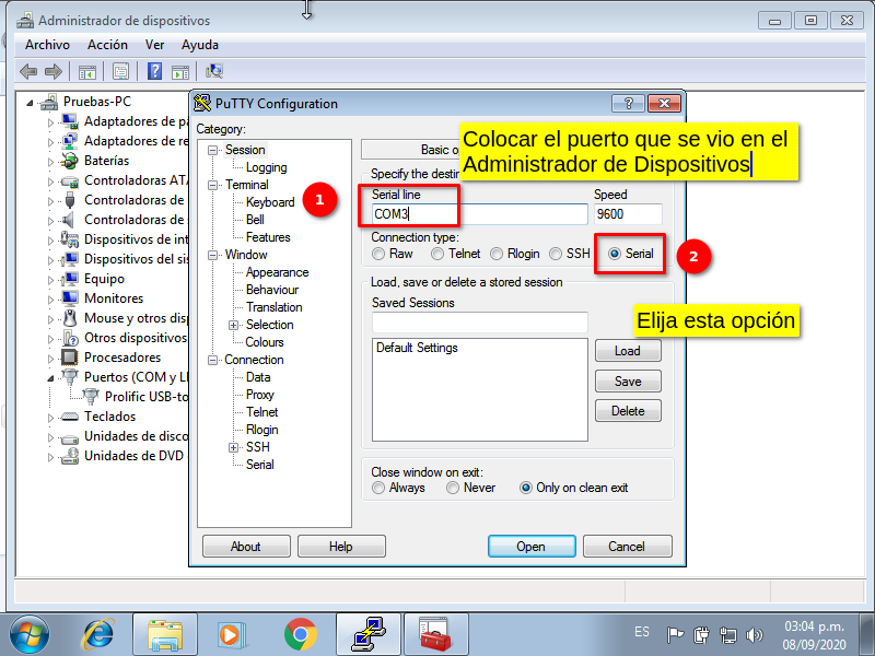 3 Debemos conectarnos a la OLT, en este caso usando la herramienta PuTTY. Al abrirla, seleccione la opción de "Serial" y escriba el puerto en el que se encuentra conectado el cable Serial. Despues de click en "Open"
