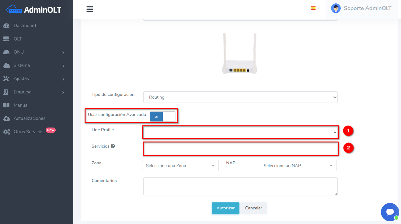 ¿Cómo puedo autorizar una ONU con configuración avanzada?