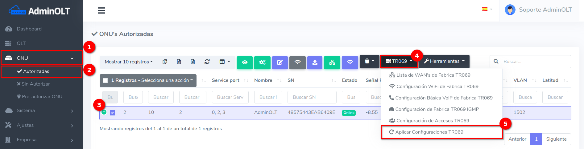 1Nos dirigirnos a la sección ONU > Autorizadas. Seleccionamos la ONU a la que vamos a agregar la WAN IP, damos Clic en TR069 > Aplicar Configuraciones TR069. Para seleccionar la opción con la leyenda Aplicar Configuraciones TR069