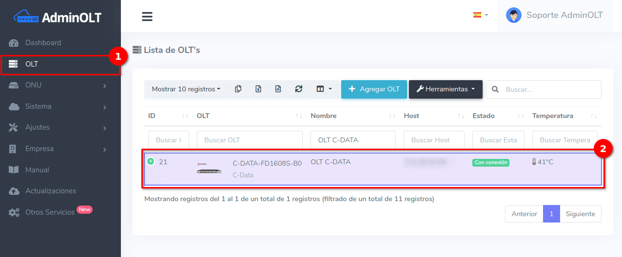 1Diríjase a la lista de OLT's y seleccioné la OLT (C-Data) que desea configurar.