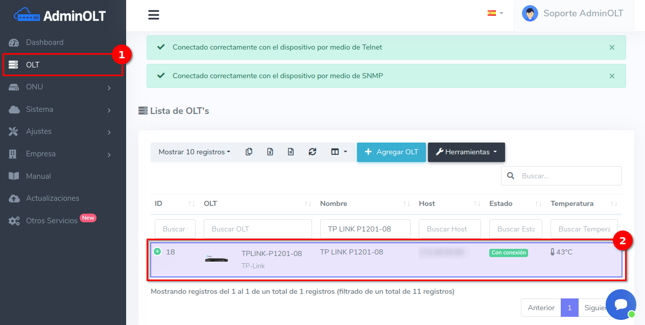 1Diríjase a la lista de OLT's y seleccioné la OLT (TP-Link) que desea configurar.