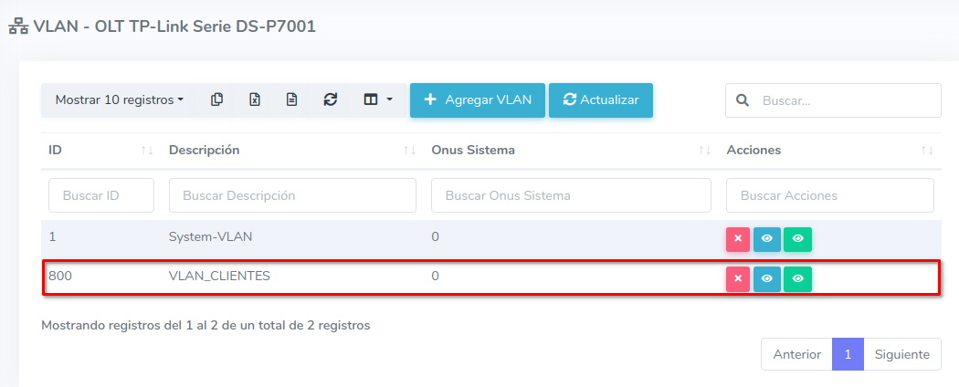 2 Después de agregar esta vlan en tu router, podremos agregarla en la OLT desde la Lista de OLT's seleccionando la OLT y la opción Lista de VLAN's.