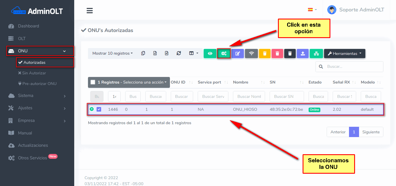 Pasos para editar información de ONU Autorizada en AdminOLT