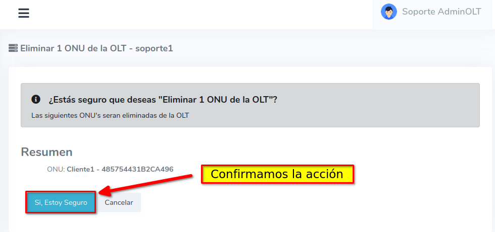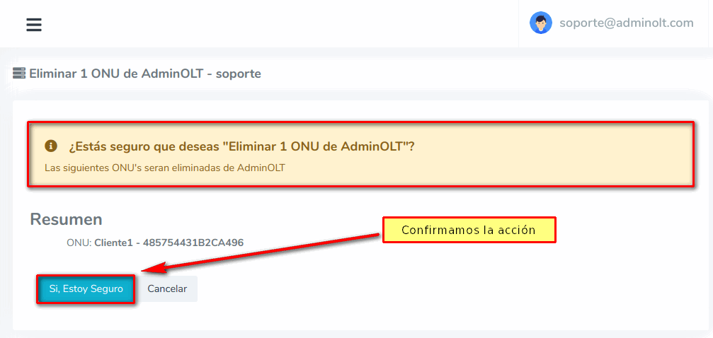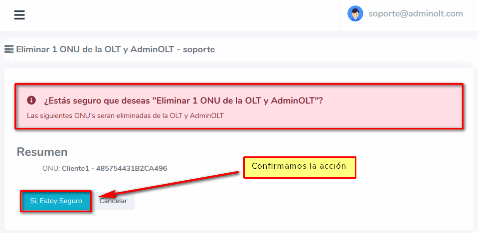 3 Confirmamos la acción de eliminar la ONU de AdminOLT