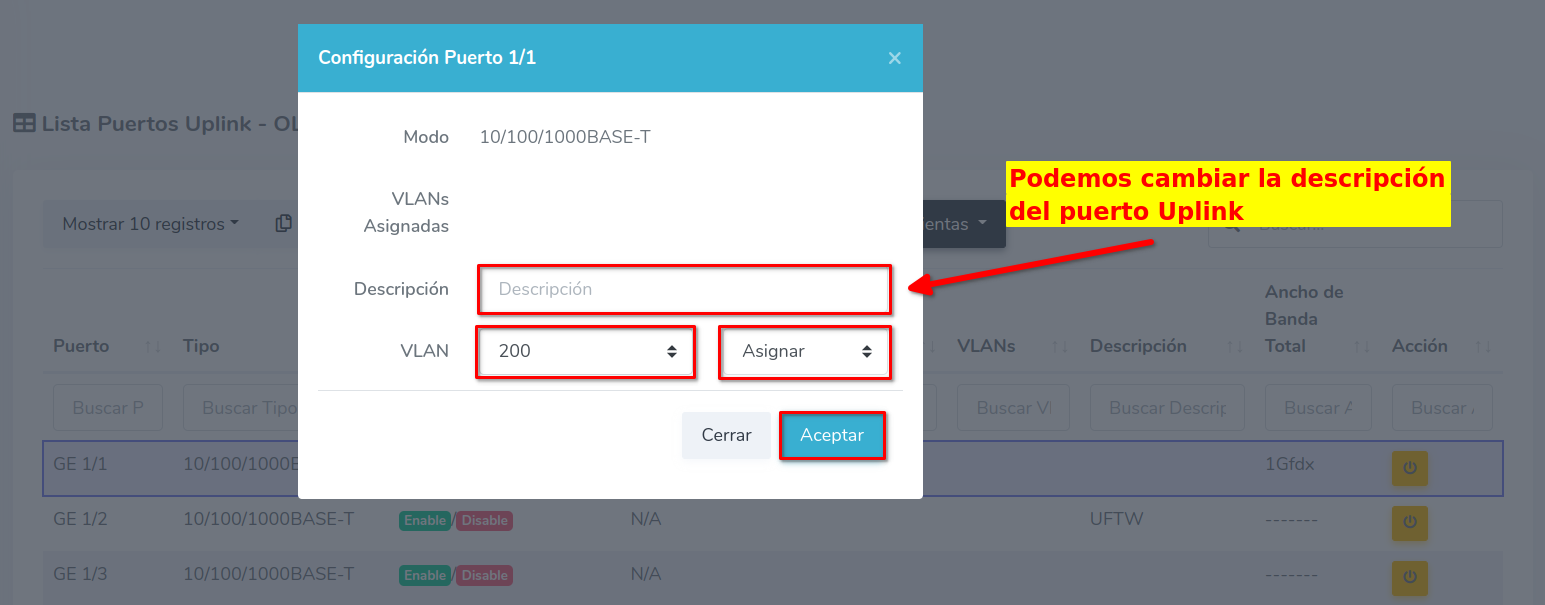 Puede escribir una descripción y escoger entre asignar o remover la VLAN
