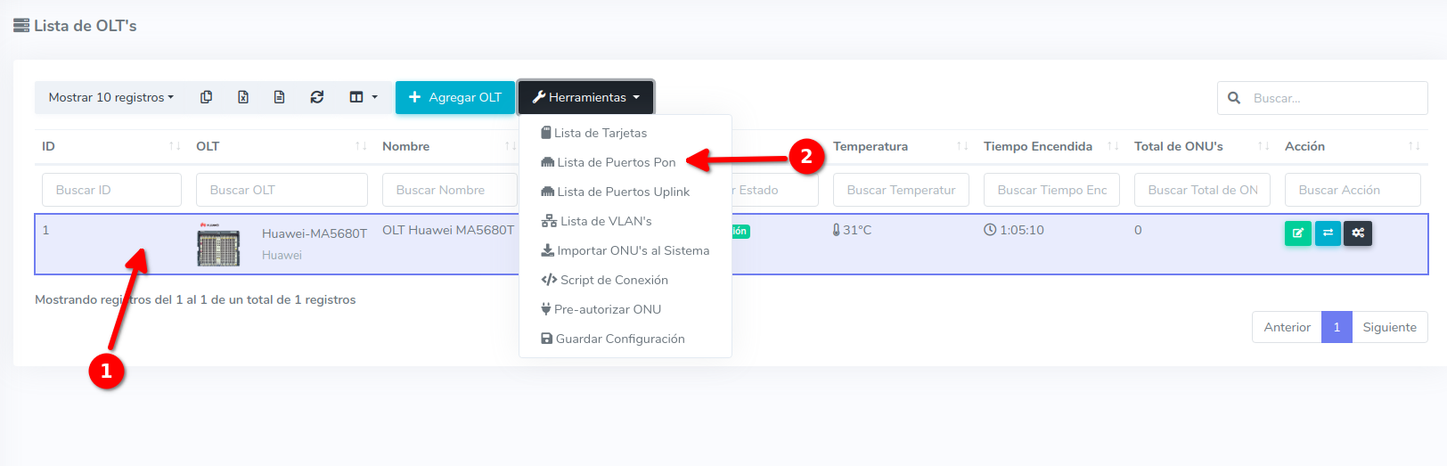1Para Habilitar los puertos PON de la OLT debemos dirigirnos a la vista de OTL's y seleccionar una OLT junto para después elegir en la sección de herramientas la opción "Lista de Puertos GPON".