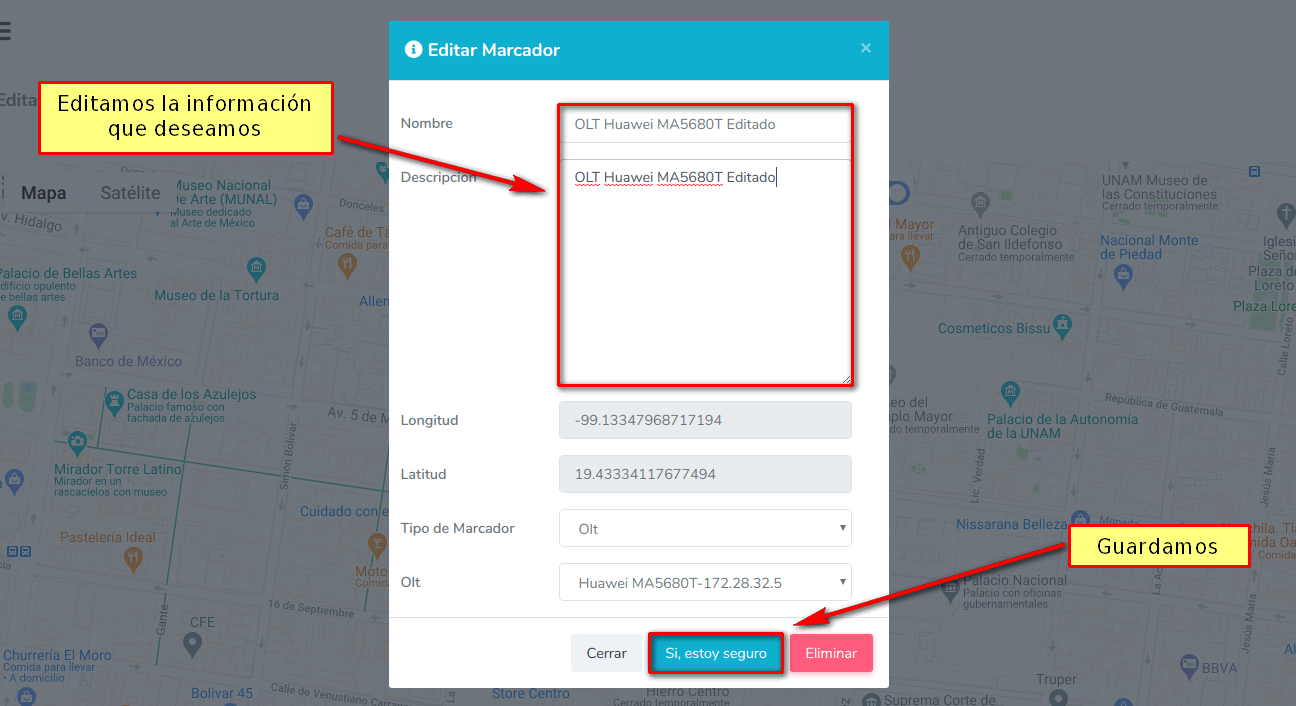 Una vez que llenemos la información, se creara el marcador en el mapa, en este caso se creo un marcador Tipo OLT, por lo tanto se creo un marcador con un icono que hace referencia a una OLT.