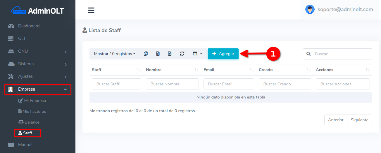 1Ir a la sección de Staff y seleccionar la opción de "Agregar Staff".